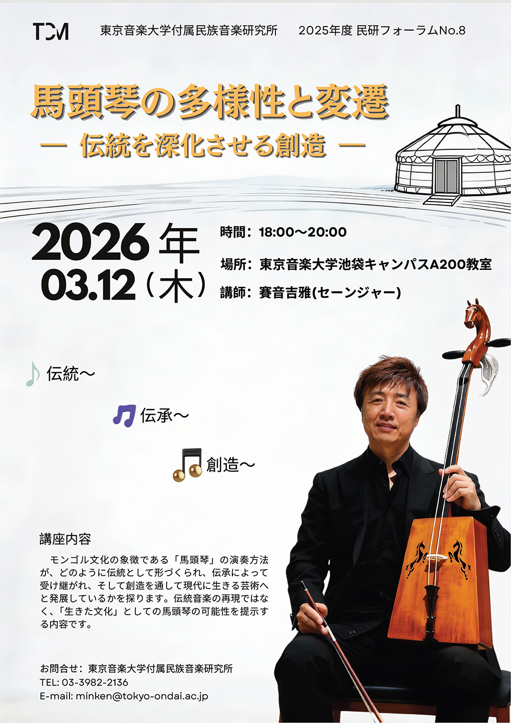 社会人を対象とした邦楽器、古楽器、民族楽器の個人レッスンで、一年を通し本格的な演奏技術、知識を学べる民族音楽等社会人特別講座の2025年度受講生募集を開始いたします。