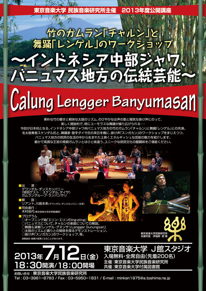 インドネシア中部ジャワ州バニュマス地方では、素朴な竹のガムラン「チャルン」と舞踊「レンゲル」が現在でも庶民の間に息づいている。 今回は、名太鼓奏者スケンダル氏と舞踊家・歌手ダイサ氏の来日を機に、日本で初めて竹のガムラン「チャルン」と舞踊「レンゲル」の共演を披露する。 太鼓や踊りのリズムに合わせた陽気な掛け声「スンガカン」のワークショップとともに、アジアの庶民の生活の中から生まれた芸能のエネルギッシュな魅力を紹介する。