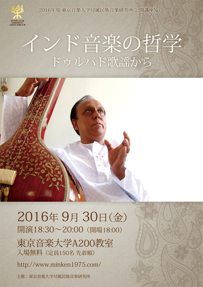 本公開講座では、インド古典音楽の長い歴史の中でも、ムガル帝国時代に北インド宮廷音楽として発達したドゥルパド歌謡を聴く。その中で、インド文化における「音(楽)」とその背景にある「哲学」を探りたい。