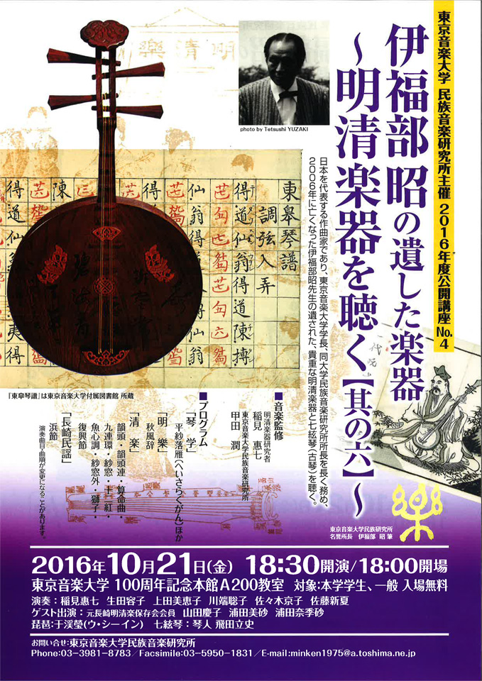 日本を代表する作曲家であり、東京音楽大学学長、同大学民族音楽研究所所長を長く務め、2006年に亡くなった伊福部昭先生の遺された、貴重な明清楽器の公開及び明清楽器を聴く