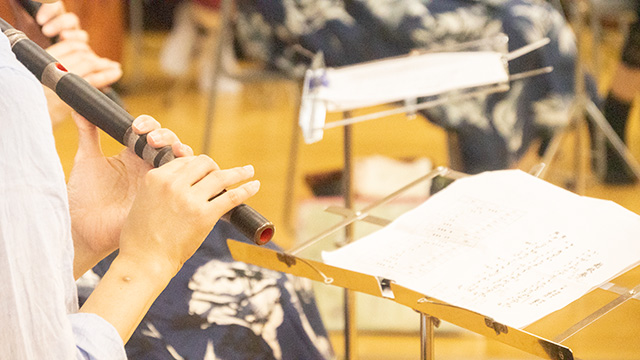 雅楽演奏の基礎となる三種の管楽器の中から龍笛を用いて、楽器の旋律を唱える「唱歌(しょうが)」を覚えながら、楽器の奏法を習います。